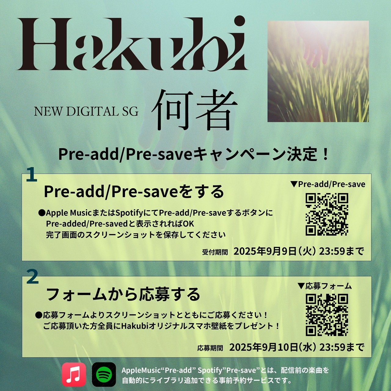 「何者」をApple MusicでPre-add、またはSpotifyでPre-save(事前予約)してくださった方全員に、「Hakubiオリジナルスマホ壁紙」をプレゼント!